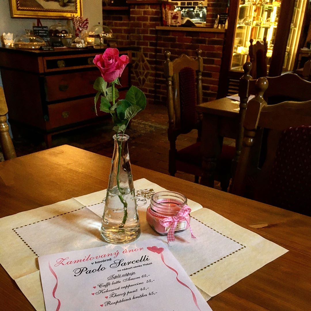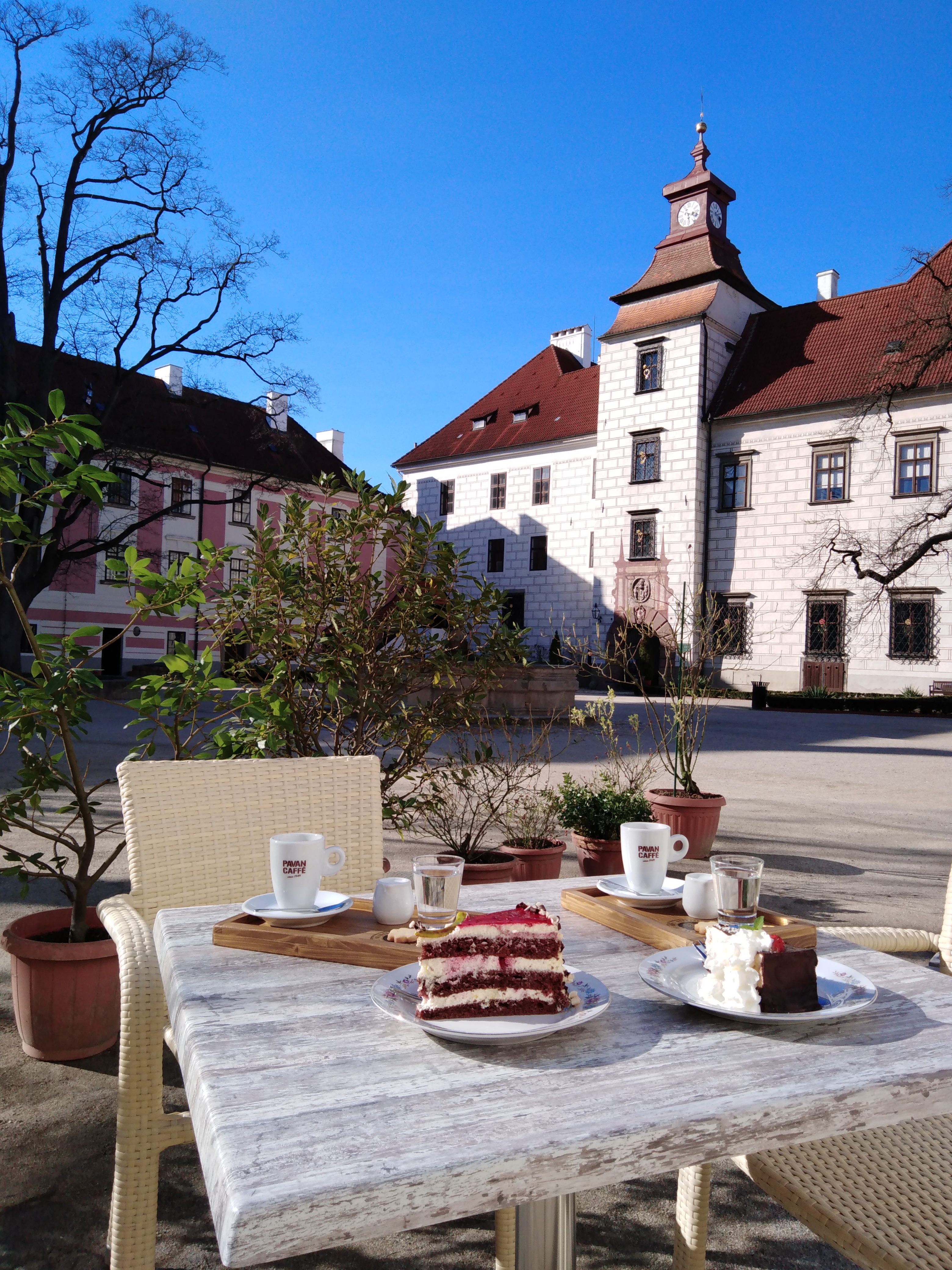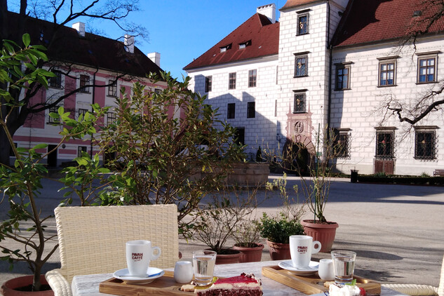 Nabízí posezení v krásných stylově zařízených prostorách na velkém nádvoří státního zámku Třeboň. Interiér vlastní kavárny je upraven v středomořském duchu. Taktéž venkovní část kavárny je připomenutím jižních krajů a to v skutku velkolepě pojaté, posezení pod nejstarším olivovníkem v Čechách, obklopeni navíc mnoha dalšími tropickými a subtropickými dřevinami a rostlinstvem.