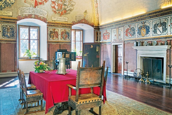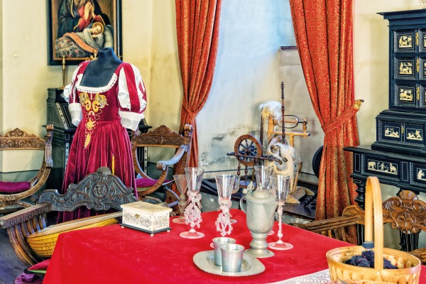 Jídelna je vybavena renesančním nábytkem, ale i sadou číší, pohárů a stolního nádobí typického pro 17. století.